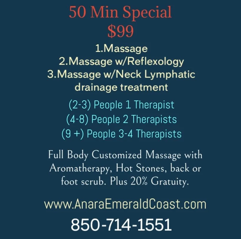 “Destin’s premier luxury mobile massage service all customizable and all inclusive. Group and couples special rates. With over 15 years experience as a licensed massage therapist in the spa industry and yoga wellness community I can customize your beach retreats, bachelerette parties, company retreats, couples massage and family vacations spa services to your individual and or group needs. Every spa service includes Aromatherapies, Hot Stones, Hot Towels, Organic Coconut Oil and Customized pressure. All services are completely customizable.”
